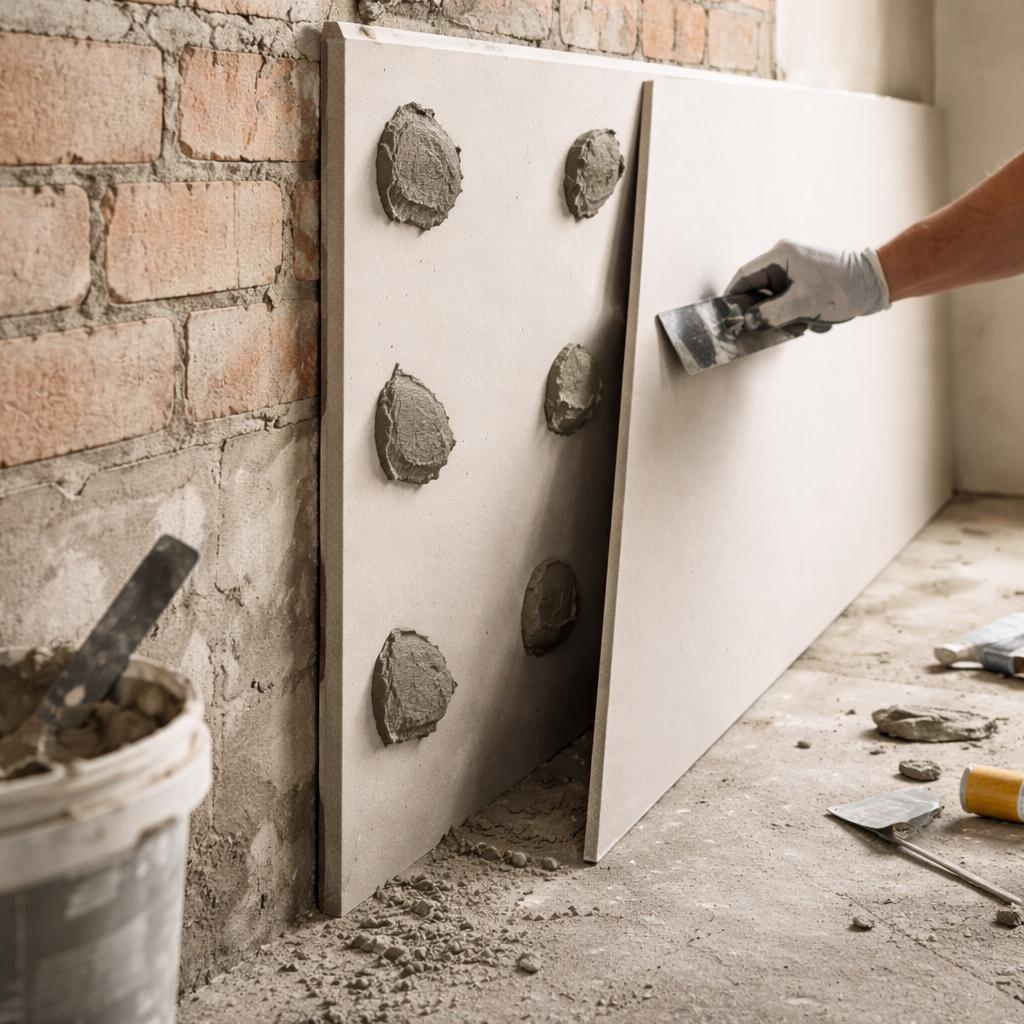 Если вы решите использовать клеевой метод, очень важно правильно выбрать клей. Он должен быть предназначен для крепления гипсокартона к бетонным или кирпичным стенам. Сегодня на рынке можно найти несколько типов клеевых составов: универсальные и специализированные. Универсальные клеи подходят для большинства поверхностей, но если стены имеют высокую влажность или особенности, такие как слабо адгезионные покрытия, лучше использовать специализированные смеси, обеспечивающие надежное сцепление.