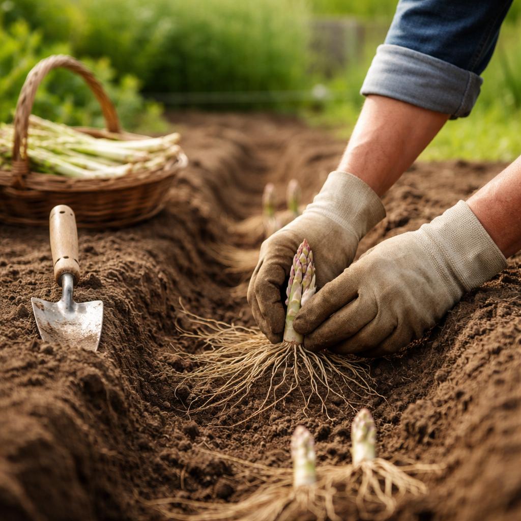 Посадка спаржи требует немного больше внимания, чем у других растений, так как это многолетнее растение. Для правильной посадки необходимо вырыть глубокие лунки (около 30 см) с хорошим дренажом, на дно которых укладываются органические удобрения. Между растениями важно оставлять пространство около 30 см, чтобы в дальнейшем побеги могли свободно развиваться.