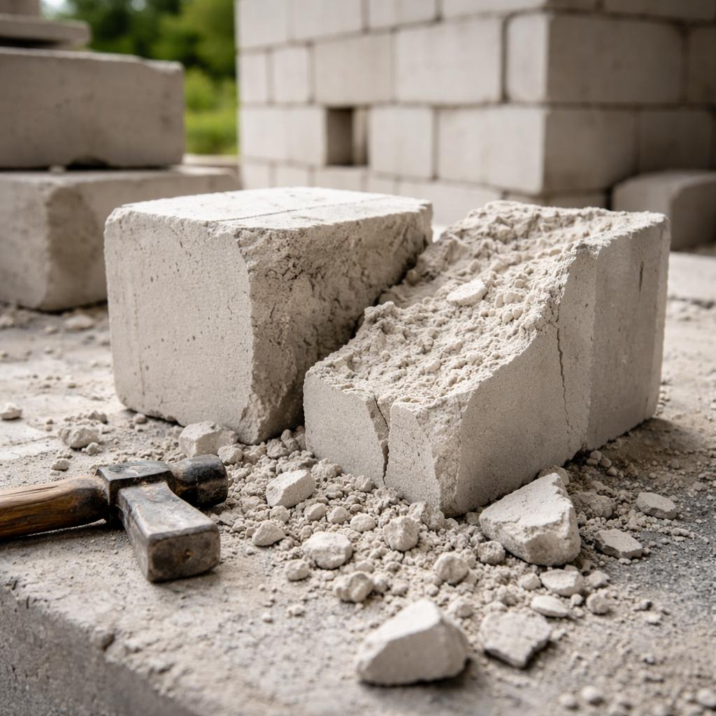 Самодельный газоблок твердеет по принципу обычного лёгкого бетона. Он может выглядеть похоже, но механика разрушения у него иная: материал не работает как единое целое, а распадается на зоны разной плотности. Это становится заметно не сразу, а при нагрузке, резке, креплении или сезонных подвижках.