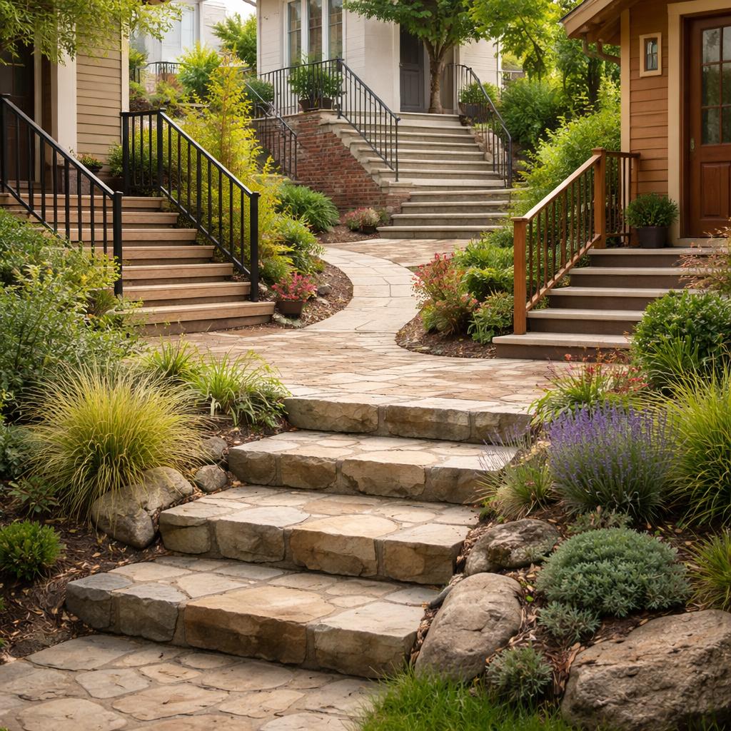 На участках с уклоном лестница иногда перестаёт быть отдельным объектом и становится продолжением ландшафта. Ступени могут идти вдоль склона, повторять его линии, частично сливаться с террасами или подпорными стенками.