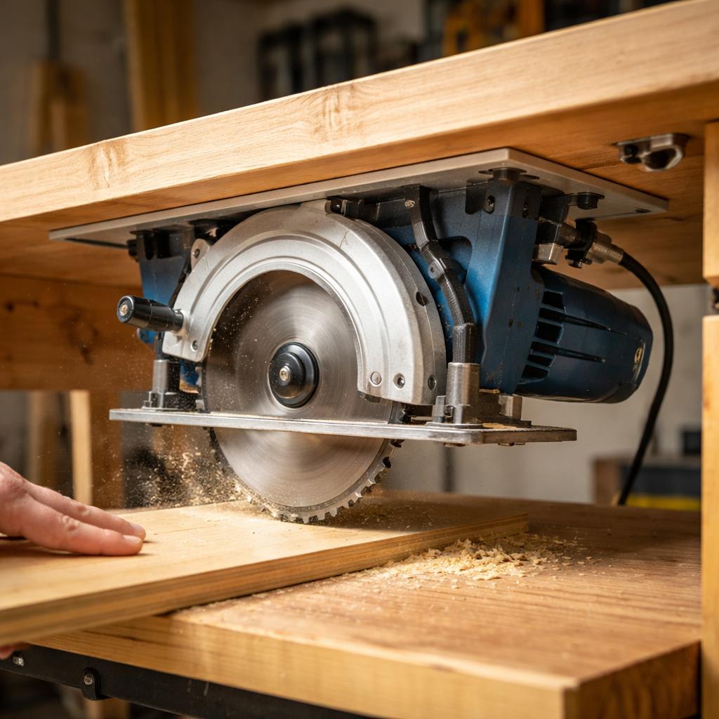 Ручная циркулярная пила изначально рассчитана на движение относительно заготовки: оператор ведёт инструмент, контролируя давление, угол и скорость. При фиксации на столе логика меняется местами — теперь заготовка движется относительно пилы. Это приводит к трём принципиальным сдвигам.